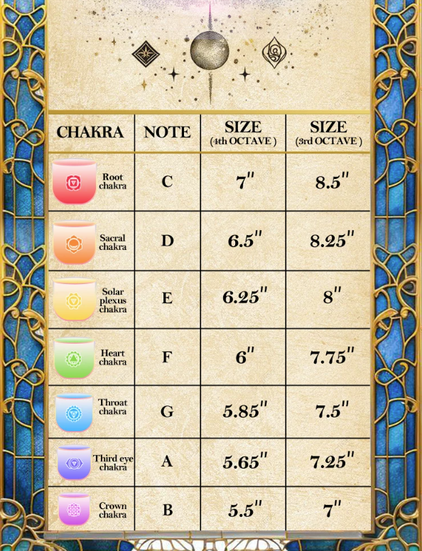 Includes the full 7-chakra scale from C through B, sized approximately within the 6”–7” range for versatile use.