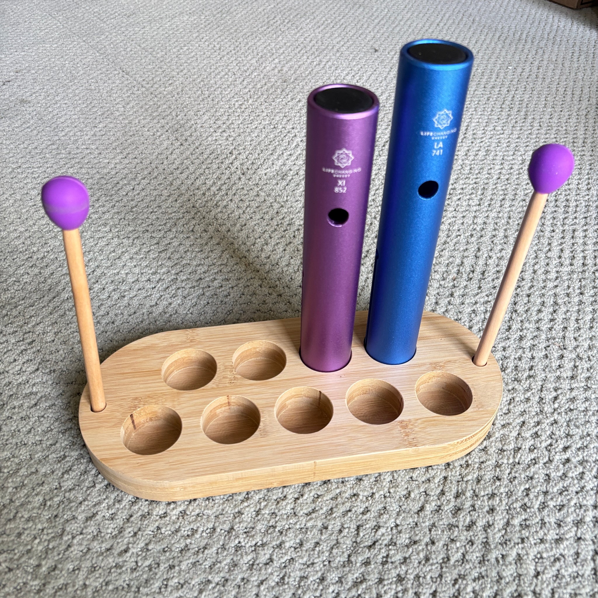 Keep your sound healing tools neatly displayed and within arm’s reach with this handcrafted wooden holder. Designed to hold up to 9 Wah Wah Tubes and 2 mallets, it ensures you can effortlessly switch between instruments during your sessions. The sturdy wooden construction provides stability, while the open design makes it easy to grab what you need without interrupting the flow of your work.