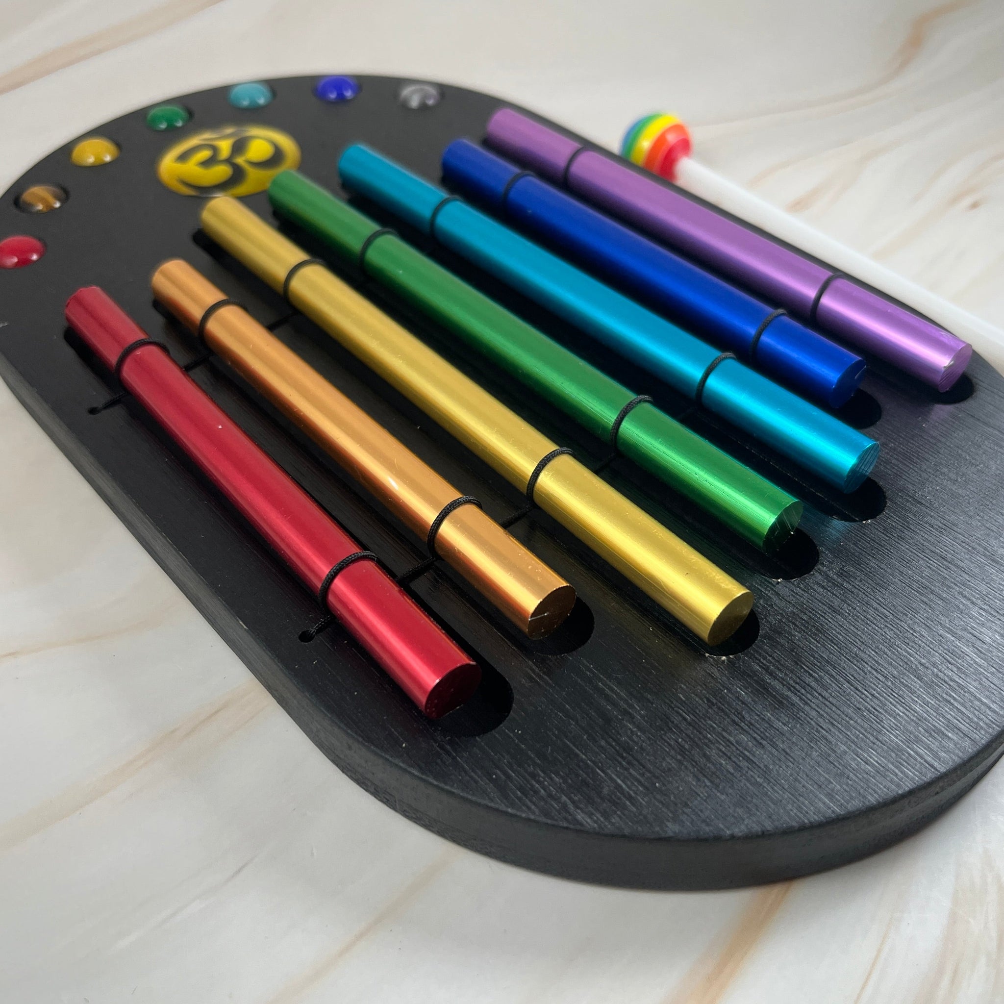 Note: aluminum is a soft material and bamboo splinters easily -- marks on the bars are normal and bamboo wood grooves may have small imperfections. Neither will affect the frequency or sound. Chime bars may shift during shipping. You can gently move them back into place.
